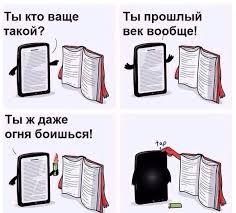 Вот что попалось в сети. Картинку можно и на уроках использовать. Например, для отработки типа речи описание или рассуждение, если добавить еще картинку, на которой бумажная книга с электронной спорят. А можно и отработку прямой речи или диалога. Задание допиши мысли сидящих.